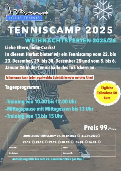 Herzlich Willkommen bei der Tennisschule Tennis Louis. Ich freue mich über dein Interesse am Tennisspiel. Mit folgendem Formular ist deine Anmeldung für das Ferientennis in den Weihnachtsferien möglich. Das Ferientennis ist für Anfänger und Fortgeschrittene gedacht. Hier könnt ihr eine oder mehrere Wochen in den Weihnachtsferien das Tennisspielen erlernen oder intensiv weiter verbessern. Selbstverständlich sind wir für dich auch persönlich unter den auf der Homepage genannten Rufnummern oder per Mail da.
